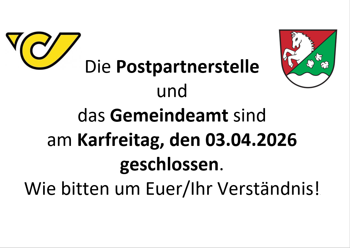 Die Postpartnerstelle und das Gemeindeamt sind am Karfreitag, 03.04.2026 geschlossen.
