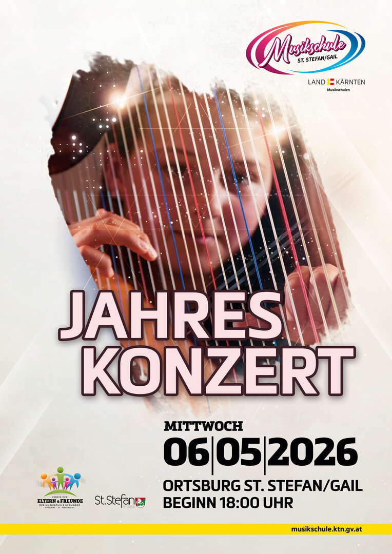Das Jahreskonzert der Musikschule St. Stefan/Gail findet am 06.05.2026 um 18:00 Uhr im Kultur- und Gemeindezentrum St. Stefan im Gailtal statt.