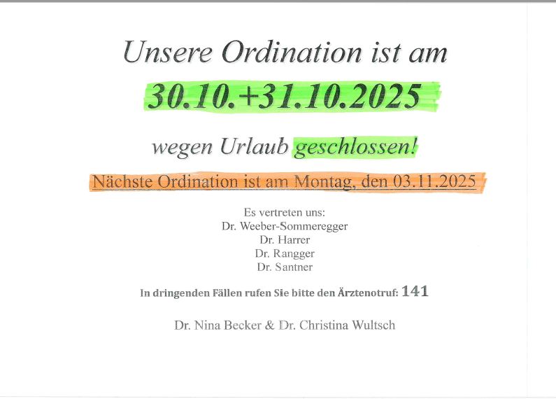 Die Ordination Dr. Nina Becker & Dr. Christina Wultsch ist am 30.10 + 31.10.2025 wegen Urlaub geschlossen!
